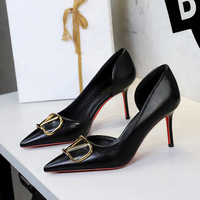 9269-A European and American style daily sexy red soled fine heeled velvet side empty high heels, shallow mouth slimming pointed single shoes for women
