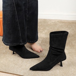 1895-1 Retro Suede Pointed Skinny Boots Thin Single Heel Middle Heel Versatile Fashion Rear Zipper Short Boots for Women