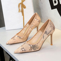 8358-AH113 European and American banquet sexy slim heel high heels, pearl lace flower pointed temperament single shoes for women